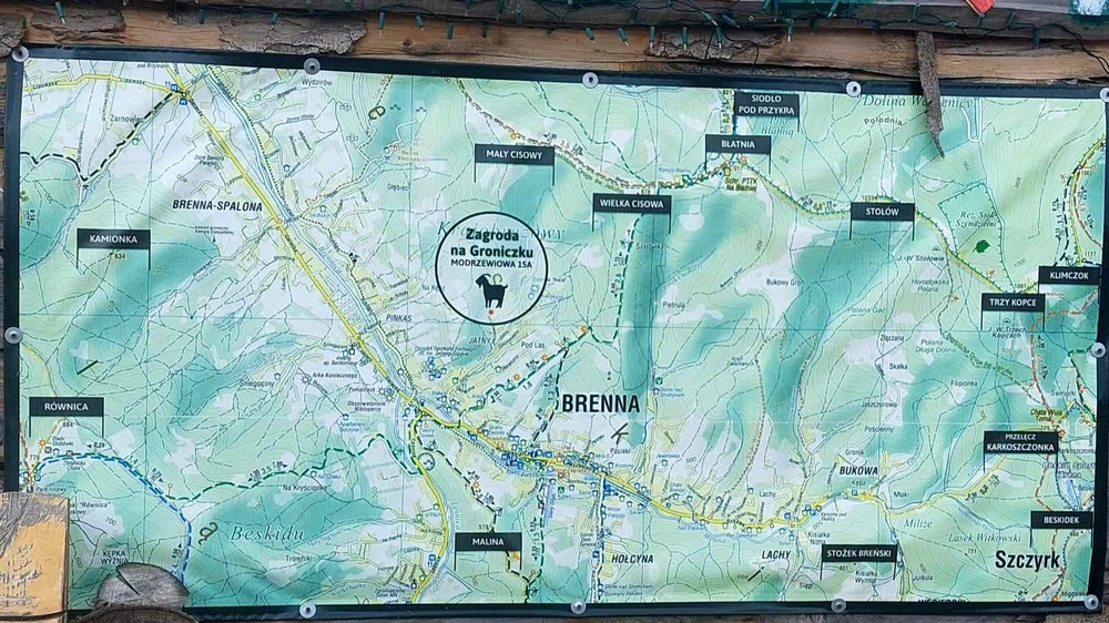 Zagroda na Groniczku jak sama nazwa wskazuje znajduje się na wzniesieniu góry, która otrzymała przydomek o nazwie Groniczek. Położony na słonecznym stoku, pod lasem, idealny dla ceniących ciszę i spokój pośród bogatej przyrody, blisko górskiego strumyka, który wpływa do rzeki Brennicy.