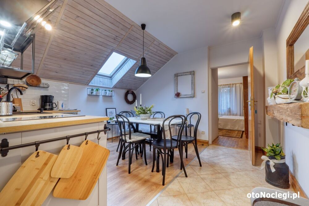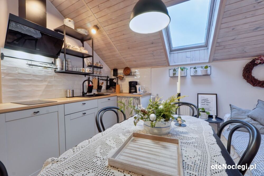 W pełni wyposażony aneks kuchenny (mikrofalówka, lodówka, czajnik, naczynia)