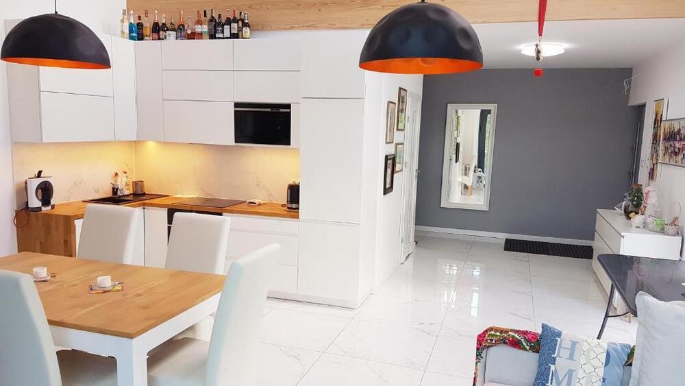 Nowoczesną kuchnię wyposażoną m.in. w lodówkę, zamrażarkę, zmywarkę, kuchenkę mikrofalową, piekarnik, ekspres do kawy,