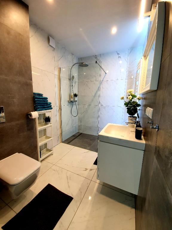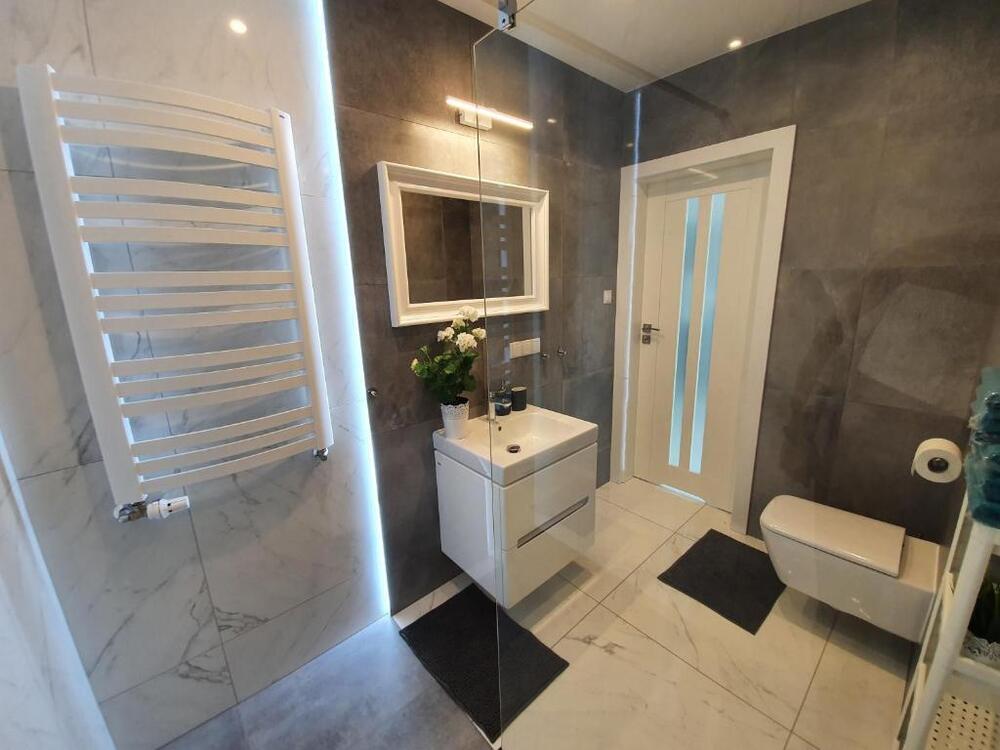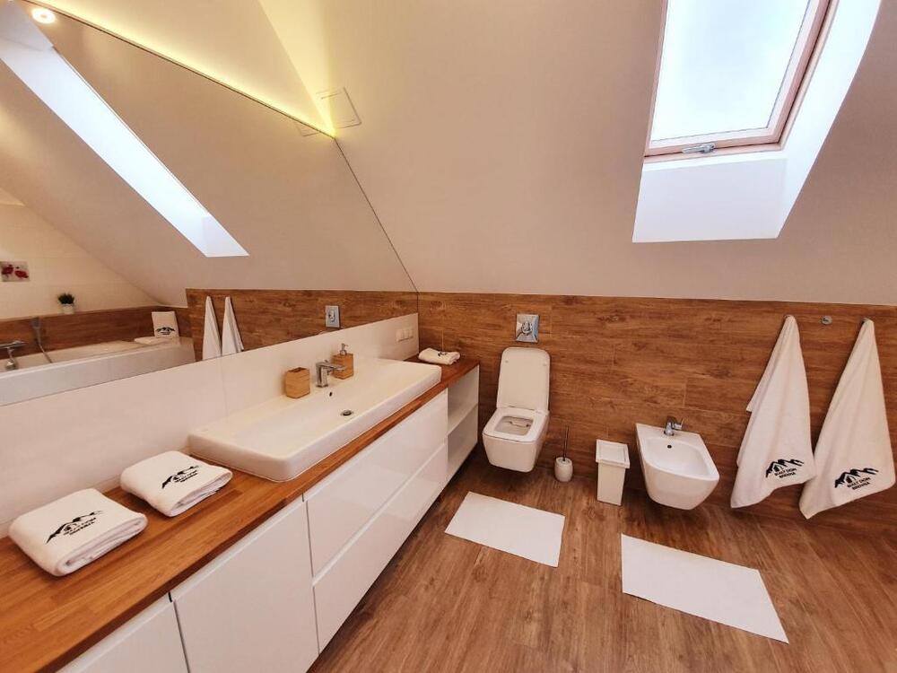 Dwie łazienki – jedna na parterze z prysznicem i toaletą, druga na piętrze z dużą wanną, toaletą i bidetem,