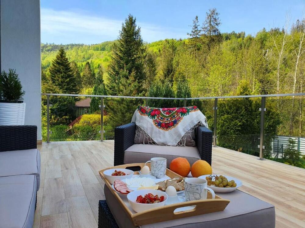 Dwa tarasy – jeden z częścią jadalną i zestawem wypoczynkowym z parasolem przeciwsłonecznym, drugi z wyjściem na ogród, skąd rozciąga się widok na góry i przystań kajakową.