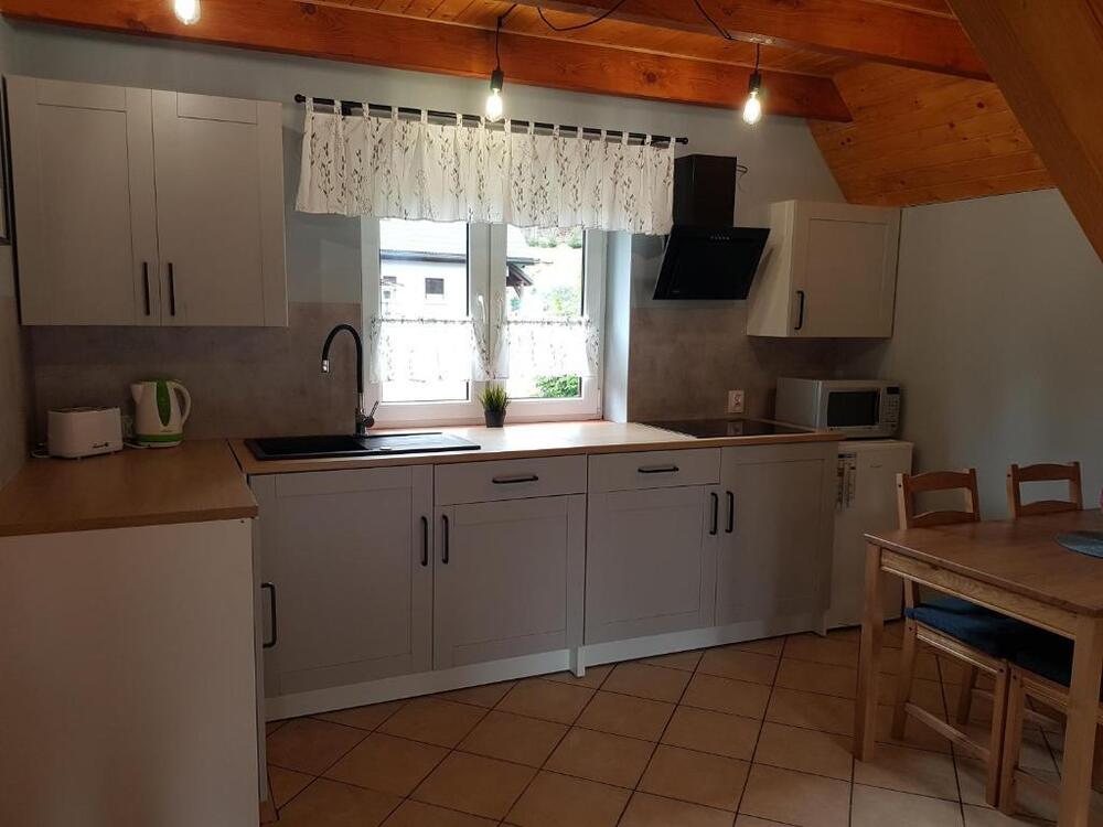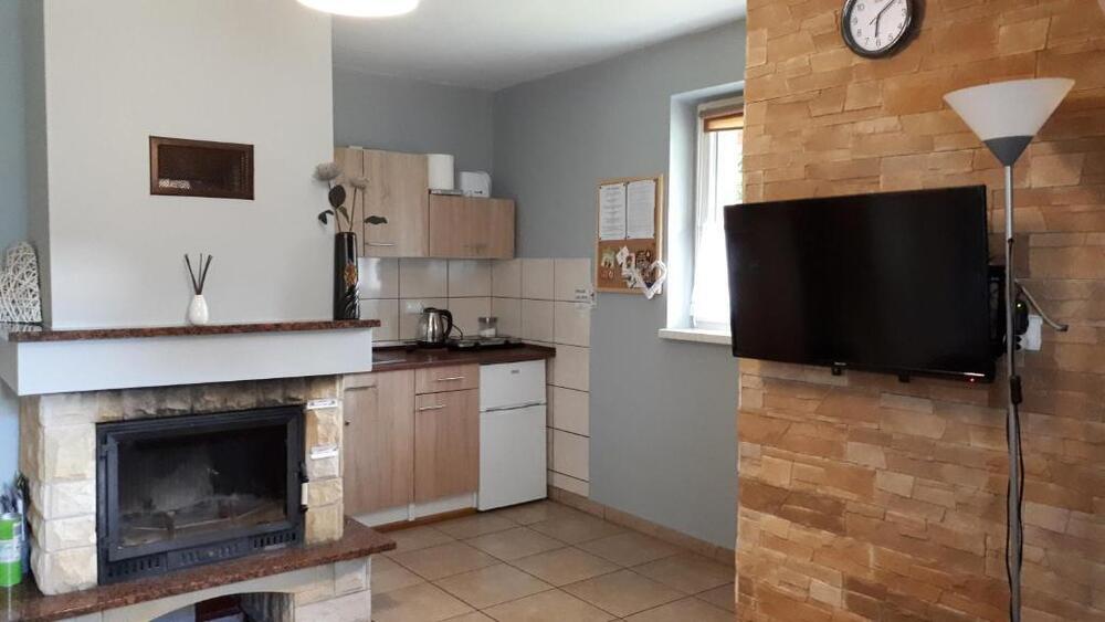 - kompletnie wyposażony aneks kuchenny (płyta indukcyjna, czajnik, mikrofalówka, toster, lodówka, podstawowe wyposażenie - sprzęt i naczynia kuchenne),