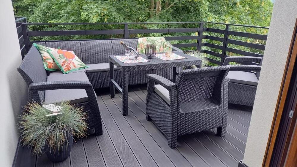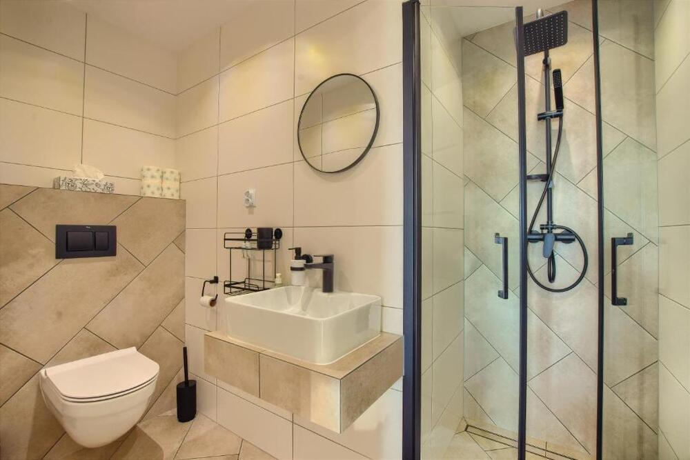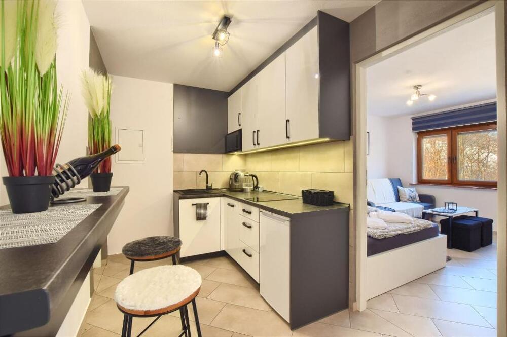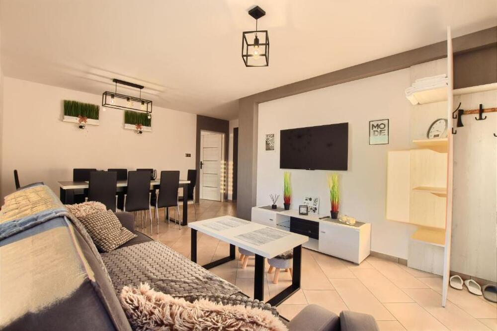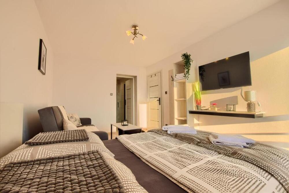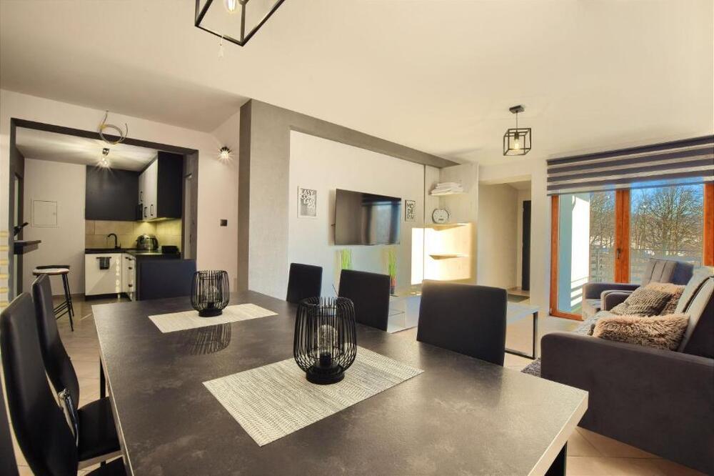 W apartamencie przygotowano dwie komfortowe sypialnie, dwie łazienki, przestronny salon z aneksem kuchennym oraz wyjściem na taras i balkon. Aneks kuchenny wyposażono w niezbędne udogodnienia, w tym lodówkę i zmywarkę. Zapewniono również pościel i ręczniki.