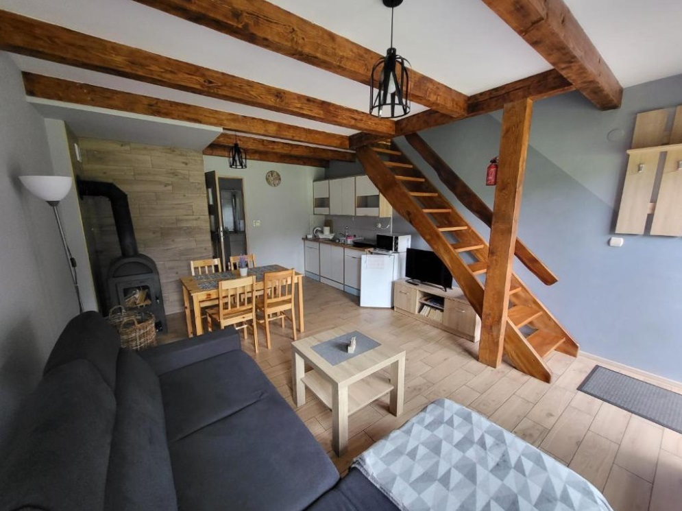 Dwupoziomowy apartament (49 m2). Na piętrze znajduje się sypialnia, a na parterze salon z kominkiem wraz z aneksem kuchennym oraz łazienką.