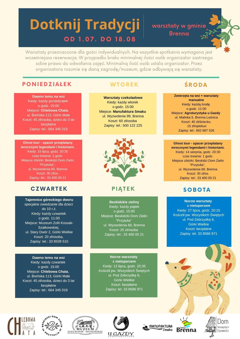 - Ghost tour - spacer przeplatany mrocznymi legendami i historiami. Kiedy: 14 sierpnia, godz. 20:30 czas trwania: 1 godz. Miejsce zbiórki: Beskidzi Dom Zielin “Przytulia”, ul. Wyzwolenia 69, Brenna Koszt: 30 zł/os. Zapisy: tel.: 33 400 00 21