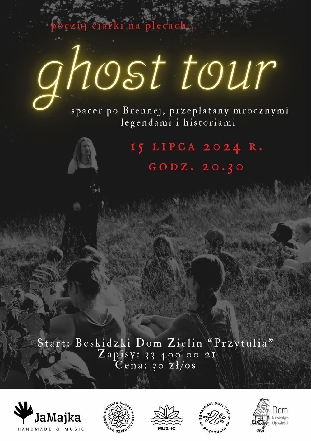 - Ghost tour - spacer przeplatany mrocznymi legendami i historiami. Kiedy: 15 lipca, godz. 20:30 czas trwania: 1 godz. Miejsce zbiórki: Beskidzi Dom Zielin “Przytulia”, ul. Wyzwolenia 69, Brenna Koszt: 30 zł/os. Zapisy: tel.: 33 400 00 21