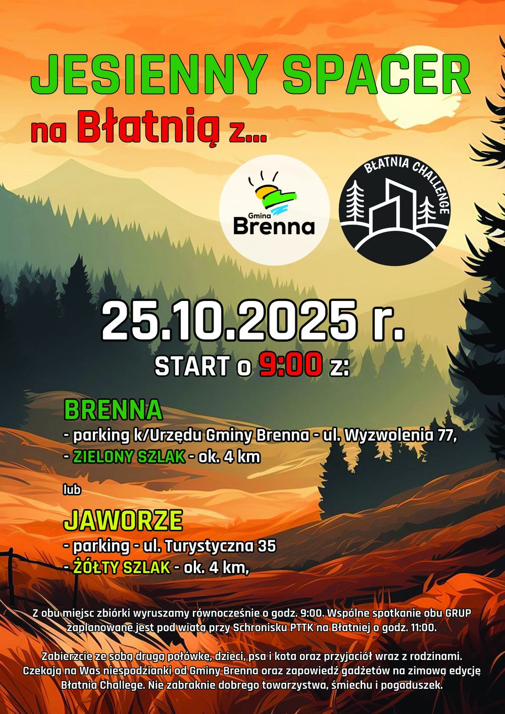 - Brennej - zbiórka na parkingu koło Urzędu Gminy w Brennej przy ulicy Wyzwolenia 77 - trasa zielonym szlakiem na Błatnią - ok. 4 km lub