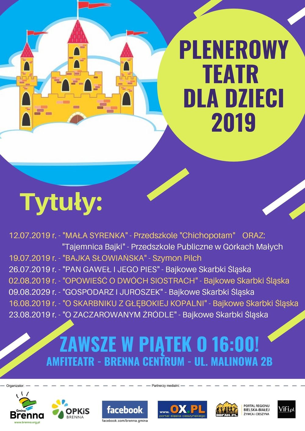 Plenerowy Teatr dla Dzieci 2019 otwiera niesamowicie zdolna i zaangażowana, pełna magicznych pomysłów grupa artystów - rodziców dzieci z przedszkola Chichopotam w Górkach Wielkich. Tym razem zaprezentują się w historii Małej Syrenki Ariel, opierając swów spektakl o bajkę opowiedzianą przez Walta Disneya. Dodatkową atrakcją tego dnia będzie występ drugiej grupy artystów - z Przedszkola Publicznego w Górkach Wielkich z bajką pod tytyłem Tajenica Bajki.