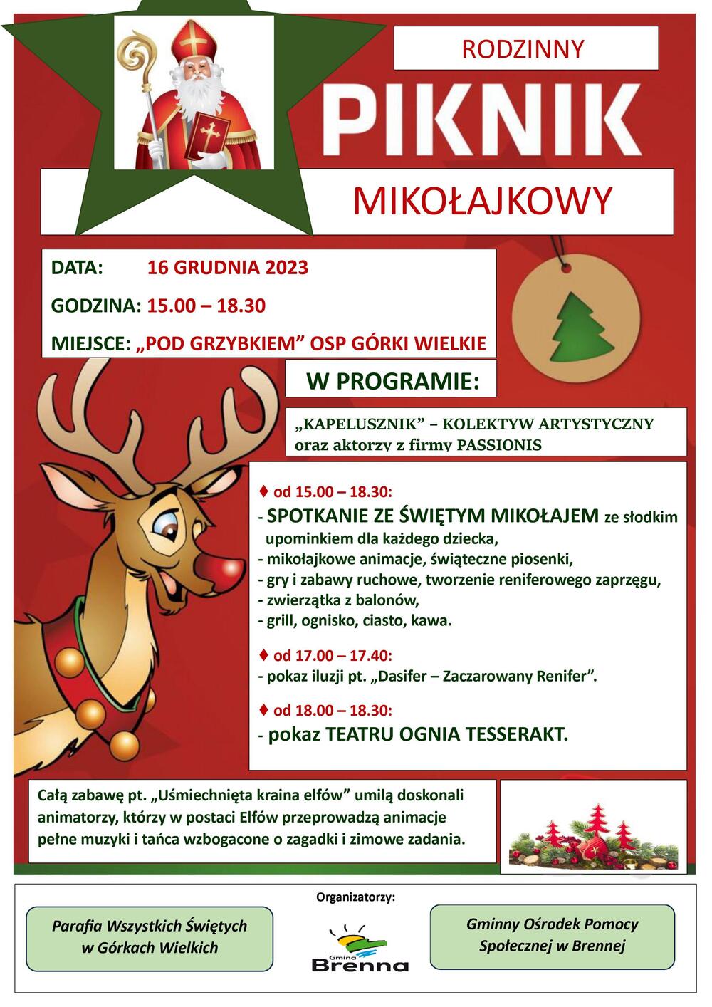 Serdecznie zapraszamy na Rodzinny Piknik Mikołajkowy, który odbędzie się w Górkach Wielkich „Pod Grzybkiem” OSP Górki Wielkie w dniu 16 grudnia 2023 r. o godz. 15.00.