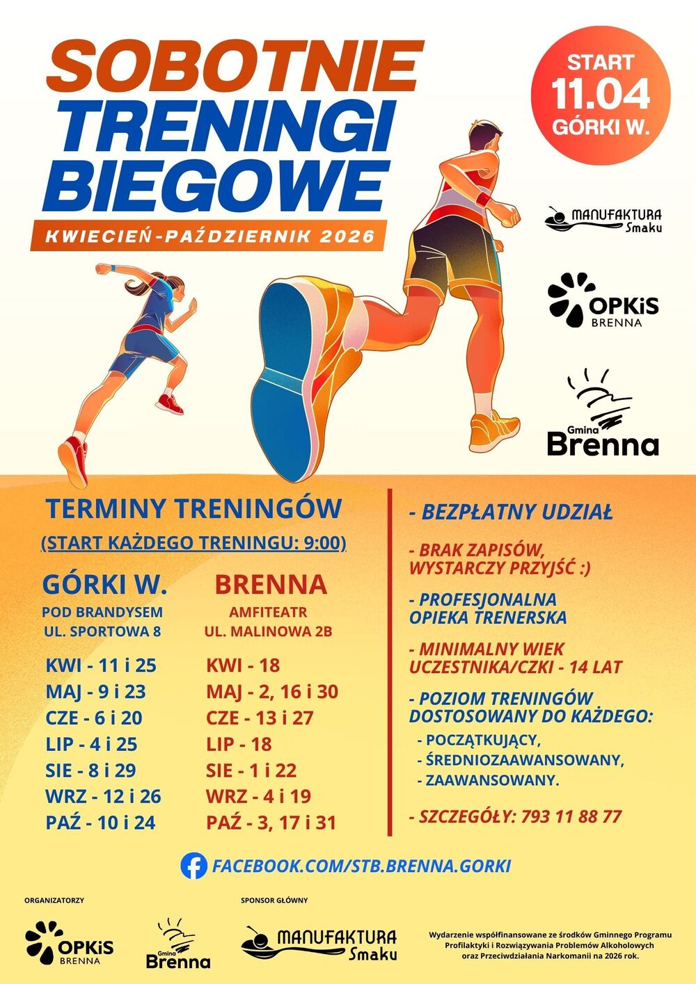 Treningi z cyklu Sobotnie Treningi Biegowe, czyli 28 treningów w okresie kwiecień-październik 2026 r., odbywających się naprzemiennie w Brennej i Górkach Wielkich pod okiem wykwalifikowanych trenerów.