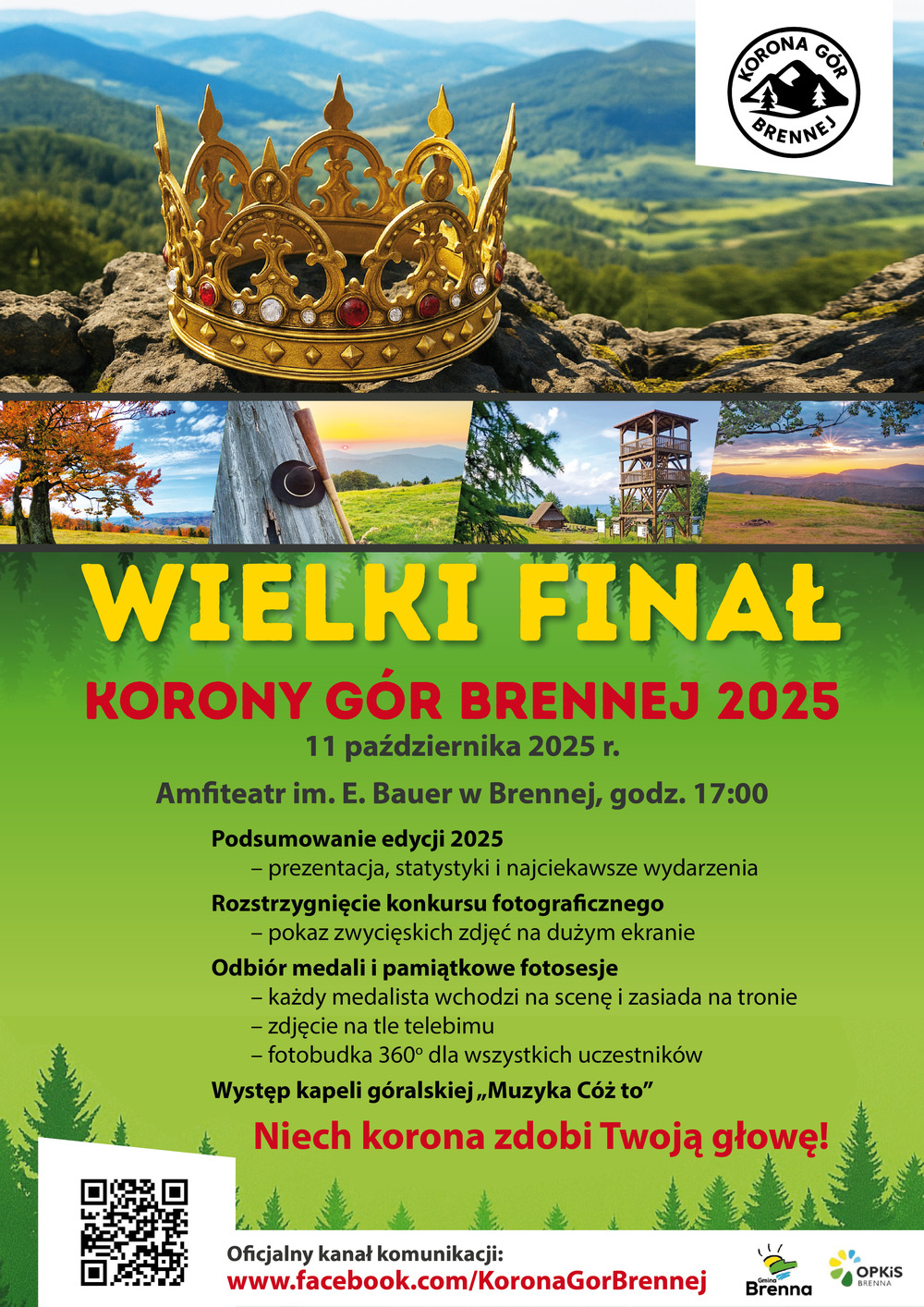 Wielki Finał Korony Gór Brennej 2025 to święto gór, sportu i dobrej zabawy. Spotkajmy się 11 października o godz. 17:00 w Amfiteatrze im. E. Bauer w Brennej, by razem podsumować tegoroczną edycję, nagrodzić medalistów i przeżyć niezapomniane chwile.