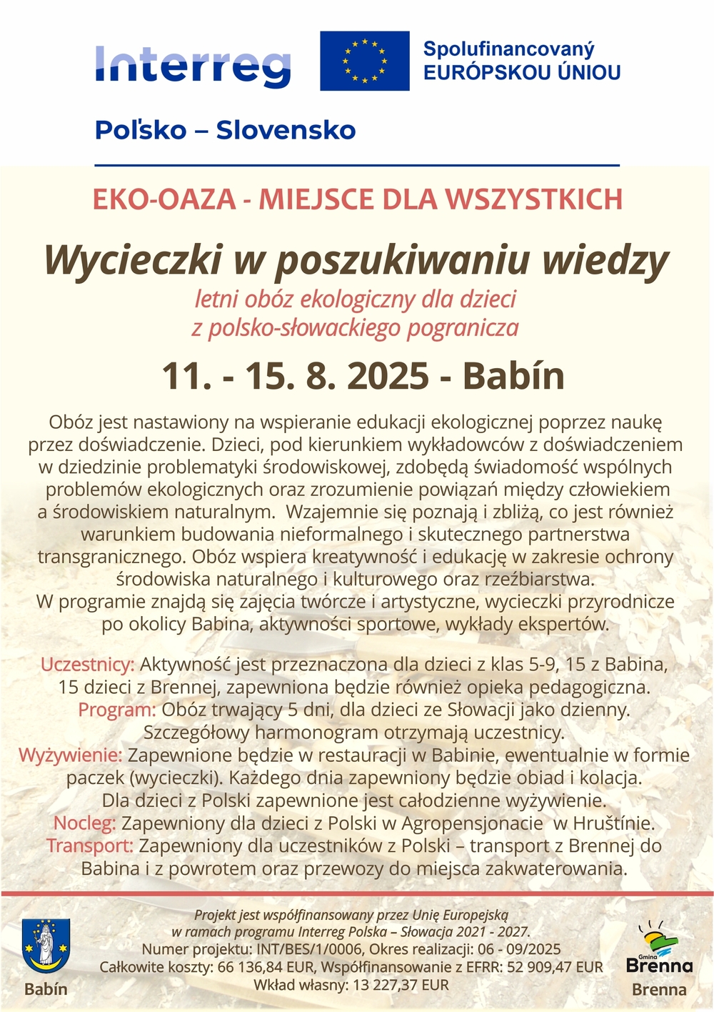 5-dniowy letni obóz dla 30 dzieci z Babína i Brennej. Program obejmuje: