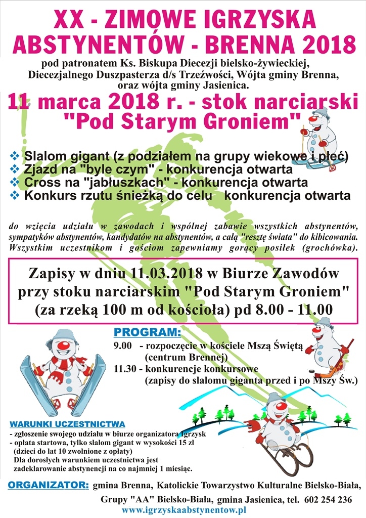 Wójt Gminy Brenna i Gminna Komisja Rozwiązywania Problemów Alkoholowych ma zaszczyt zaprosić na XX - Zimowe Igrzyska Abstynentów - Brenna 2018, które odbędą się 11 marca 2018 r., w Brennej na stoku „Starego Gronia”