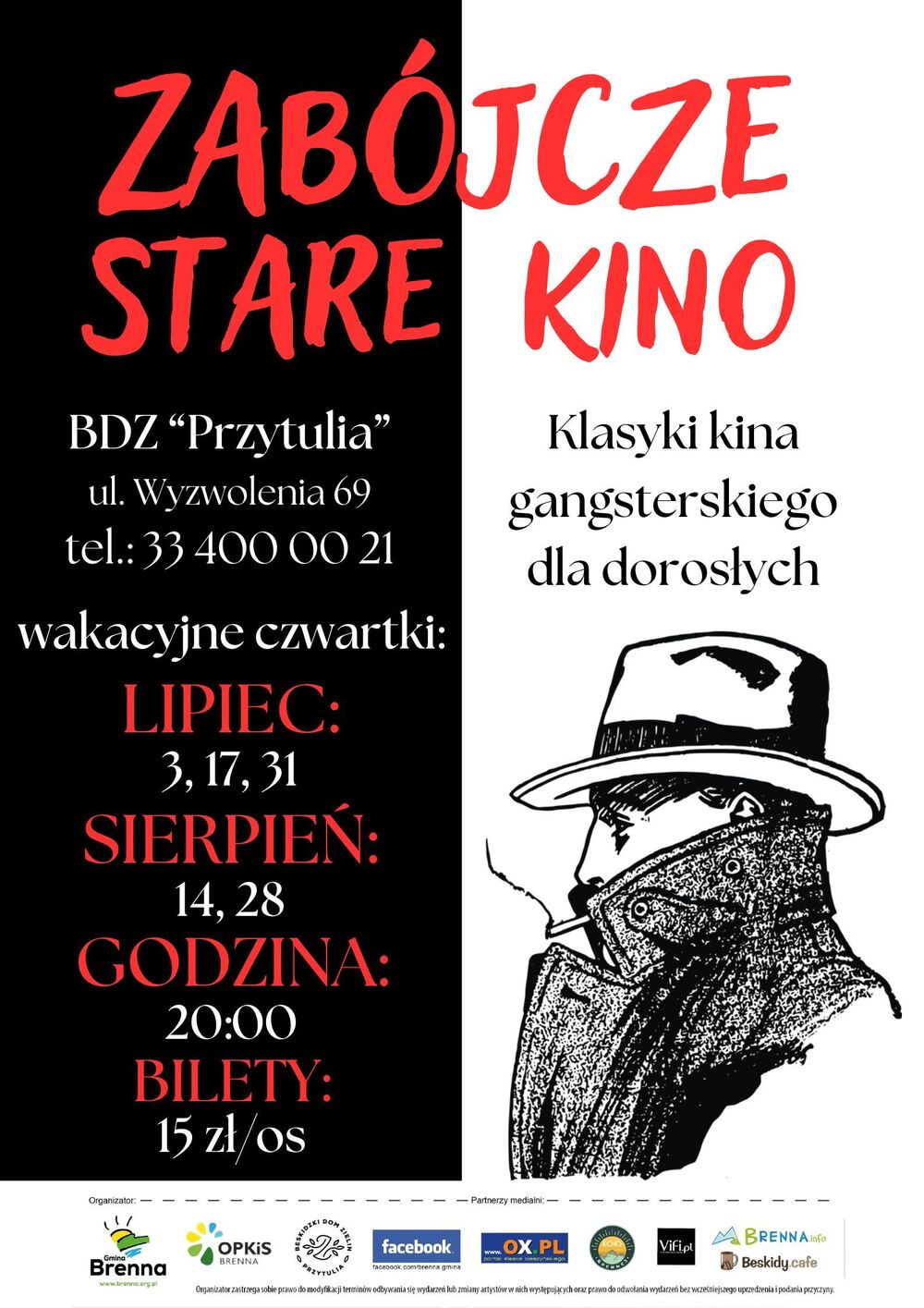Zapraszamy na wyjątkowy cykl seansów "Zabójcze Stare Kino", podczas którego przeniesiemy się do świata gangsterskich intryg, szybkich strzałów i kultowych postaci. W magicznej scenerii Starego Kina w Brennej - czyli dzisiejszego Beskidzkiego Domu Zielin "Przytulia" - na wielkim ekranie zobaczycie najlepsze klasyki kina gangsterskiego – filmy, które na zawsze zapisały się w historii kinematografii.