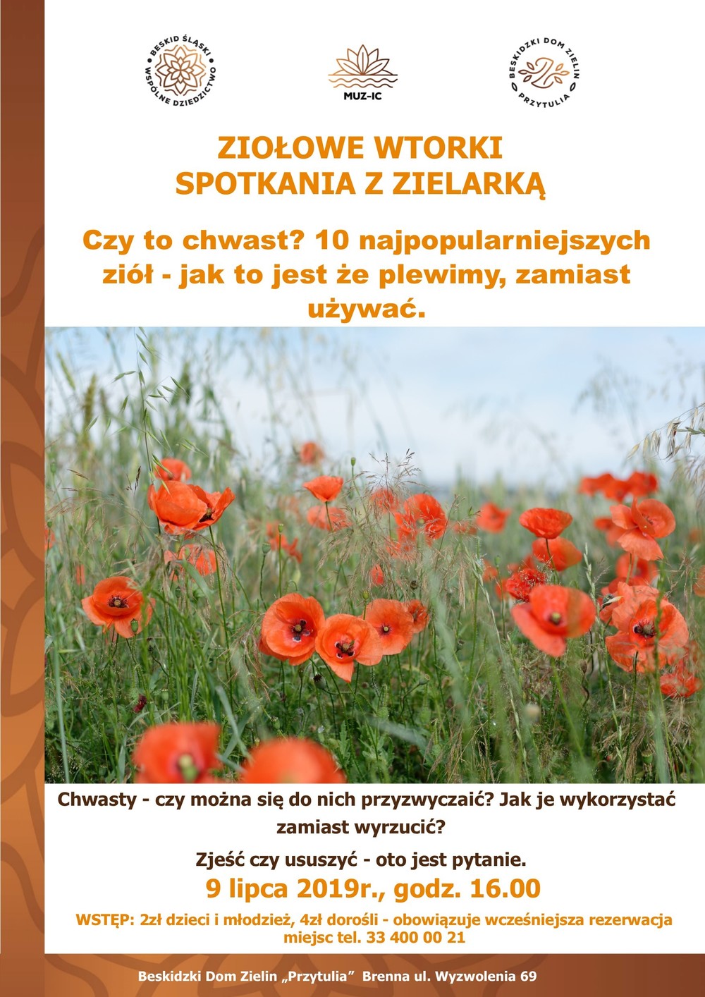 Serdecznie zapraszamy na spotkanie z Zielarką - "Czy to chwast? 10 najpopularniejszych ziół - jak to jest, że plewimy zamiast używać", które odbędzie się 9 lipca 2019r. o godz. 16:00 w Beskidzkim Domu Zielin "Przytulia".