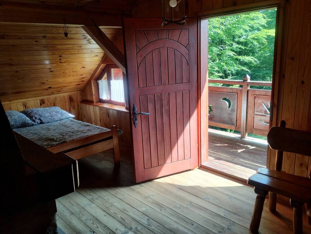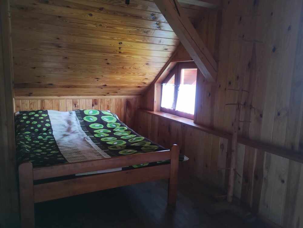 6 miejsc noclegowych: 2 pokoje 3 osobowe. Wynajmując domek dostajecie Państwo klucze i cały domek należy do Was. Dbając o to aby czas spędzony na wypoczynku w naszej chatce, był czasem niepowtarzalnym i pełnym niezapomnianych wrażeń w ciepłej atmosferze oddajemy do Państwa dyspozycji. Parter: kuchnia z wyposażeniem ( piec kaflowy, kuchenka gazowa, lodówka, czajnik, aneks kuchenny – pełne wyposażenie; garnki, szklanki, talerze, sztućce, kieliszki itd. Ława, dwa stoły, krzesła. Łazienka ( prysznic, umywalka, WC ). Jest ciepła woda i prąd. Piętro wyżej do dyspozycji państwa są salon biesiadny z kominkiem idealne miejsce do wieczornych pogawędek i śpiewu przy dźwiękach gitary. Zapewniamy nieograniczony opał do kominka. 2 sypialnie ( sypialnia zawiera 1 łóżko podwójne i 1 pojedyncze, szafki nocne, pościel). Na poddaszu duży materac. Balkon , leżaki, miejsce na grilla.