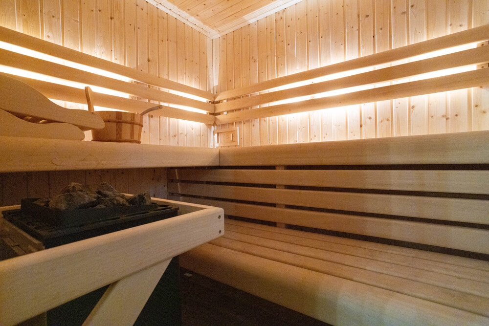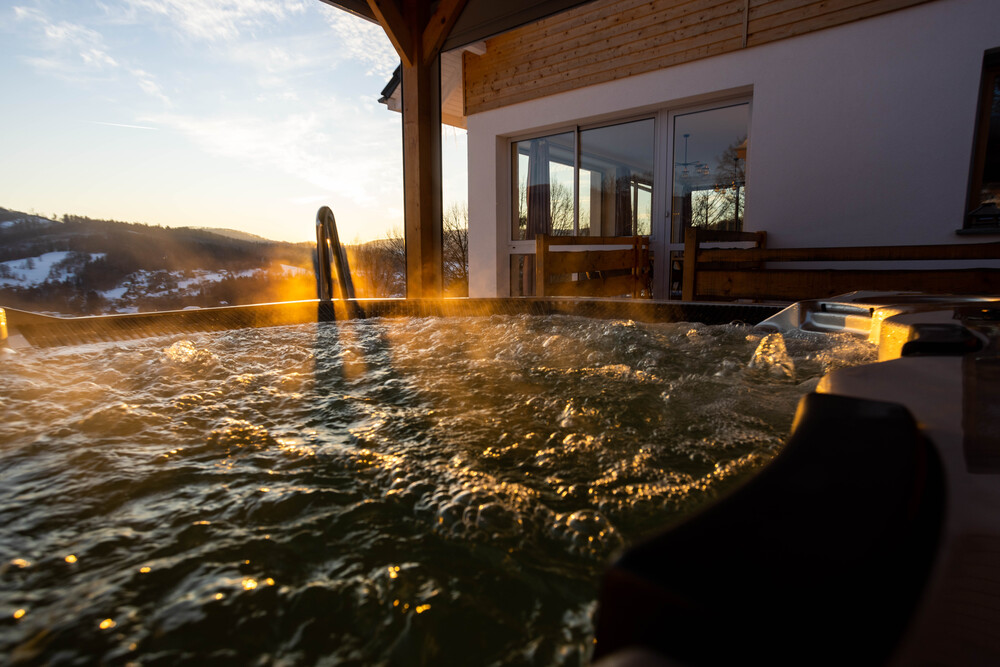 Strefa relaksu obejmuje saunę oraz zewnętrzne jacuzzi, idealne na wieczorny odpoczynek po górskich wędrówkach.