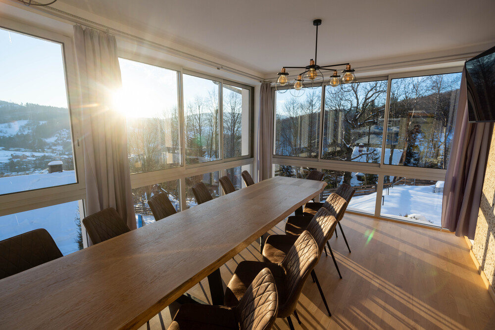Do dyspozycji gości znajduje się 6 wygodnych, dwuosobowych sypialni, 2 łazienki, przestronny salon połączony z w pełni wyposażoną kuchnią oraz przeszklona jadalnia z dużym stołem, z której podziwiać można zachwycający widok na góry o każdej porze dnia.