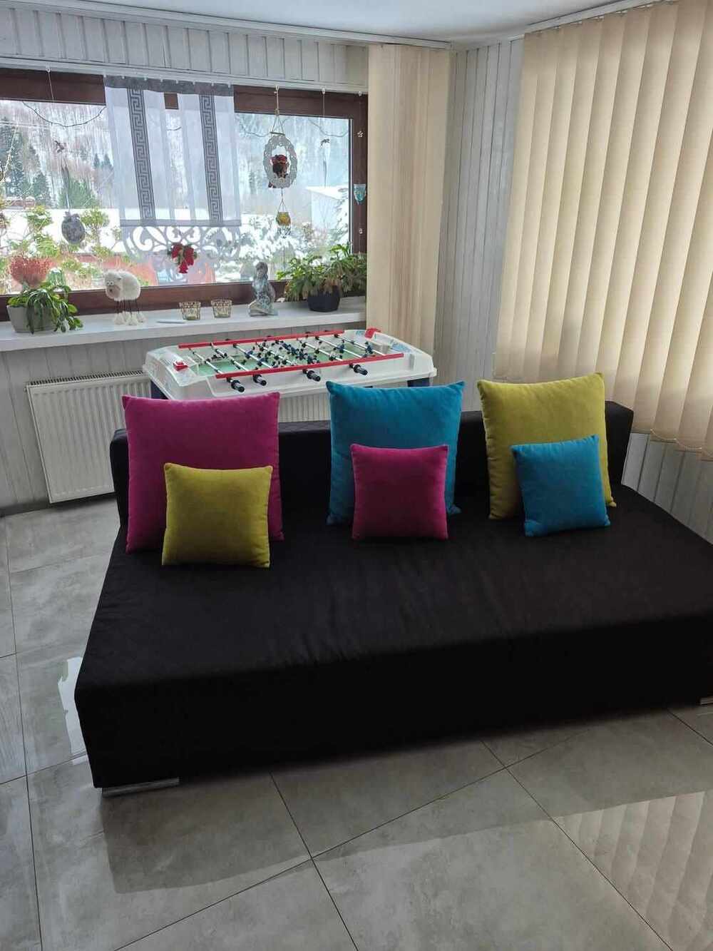 Łazienka wyposażona jest w prysznic, suszarkę do włosów i ręczniki. Dla dzieci przygotowaliśmy kącik z grą w piłkarzyki, huśtawkami, piaskownicą, trampoliną oraz basenem w okresie letnim. Są także leżaki, miejsce na grilla i ognisko.