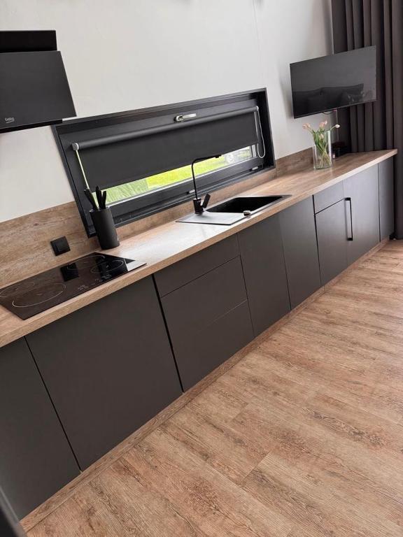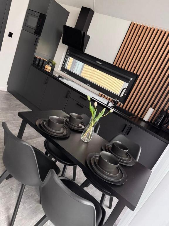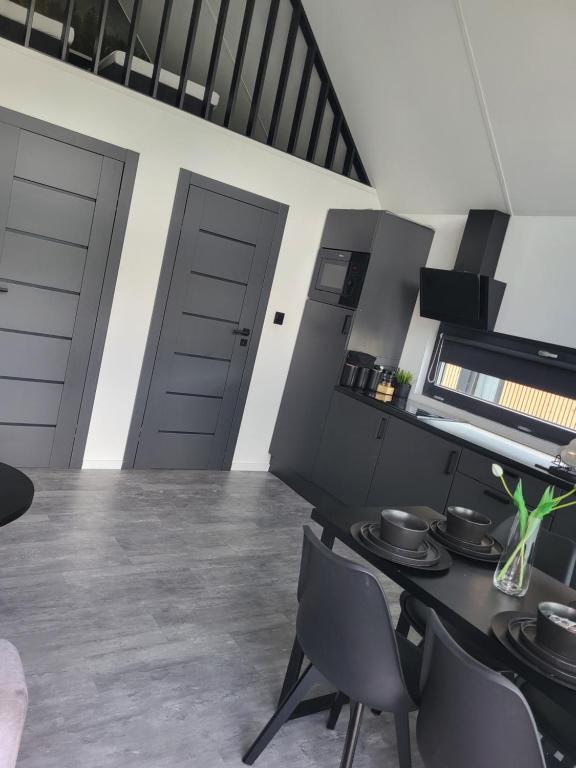 - w pełni wyposażona kuchnia, w której znajdziesz: płytę kuchenną, lodówkę z zamrażarką, czajnik elektryczny, mikrofalówkę, garnki, patelnie, sztućce, deski, noże, zastawę stołową, ścierki oraz środki czystości